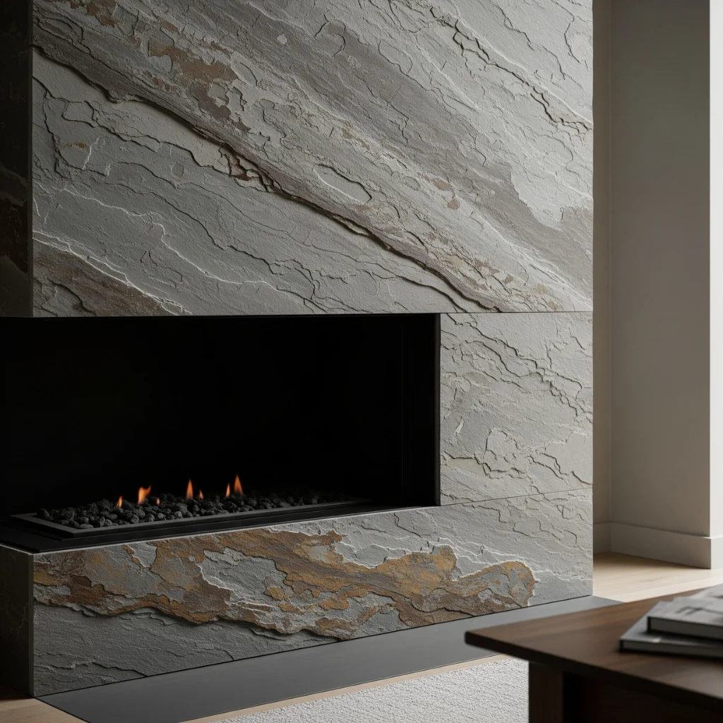 Steinfurnier besteht aus dünnen Schichten echten Natursteins (z. B. Schiefer), die mit Kunstharz und Glasfasern verstärkt sind. Dadurch ist es leicht, flexibel, einfach zu montieren und äußerst langlebig – eine attraktive Alternative zu schweren Natursteinplatten.