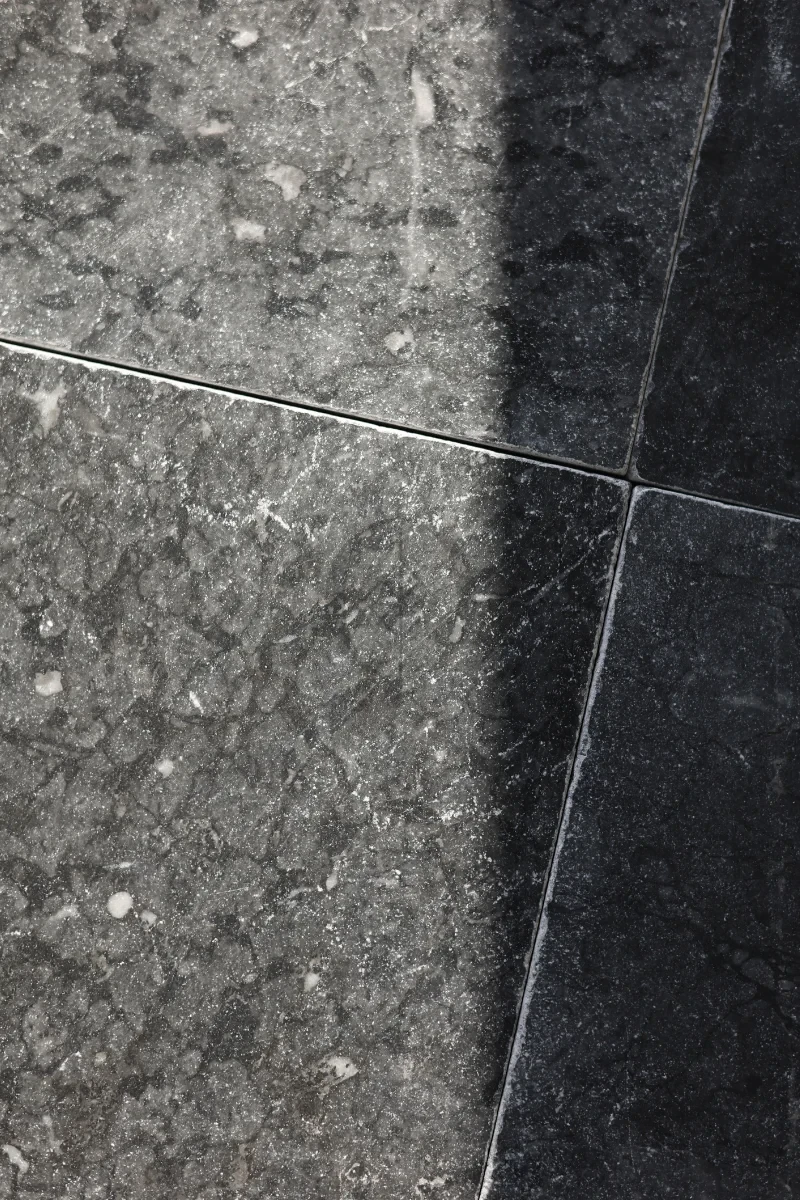 Marmorfliese Black Storm, trommelbearbeitet, 30,5×30,5×1 cm – tiefschwarzer Naturmarmor mit dezenten Adern und gealterter Oberfläche, ideal für elegante Innenräume.