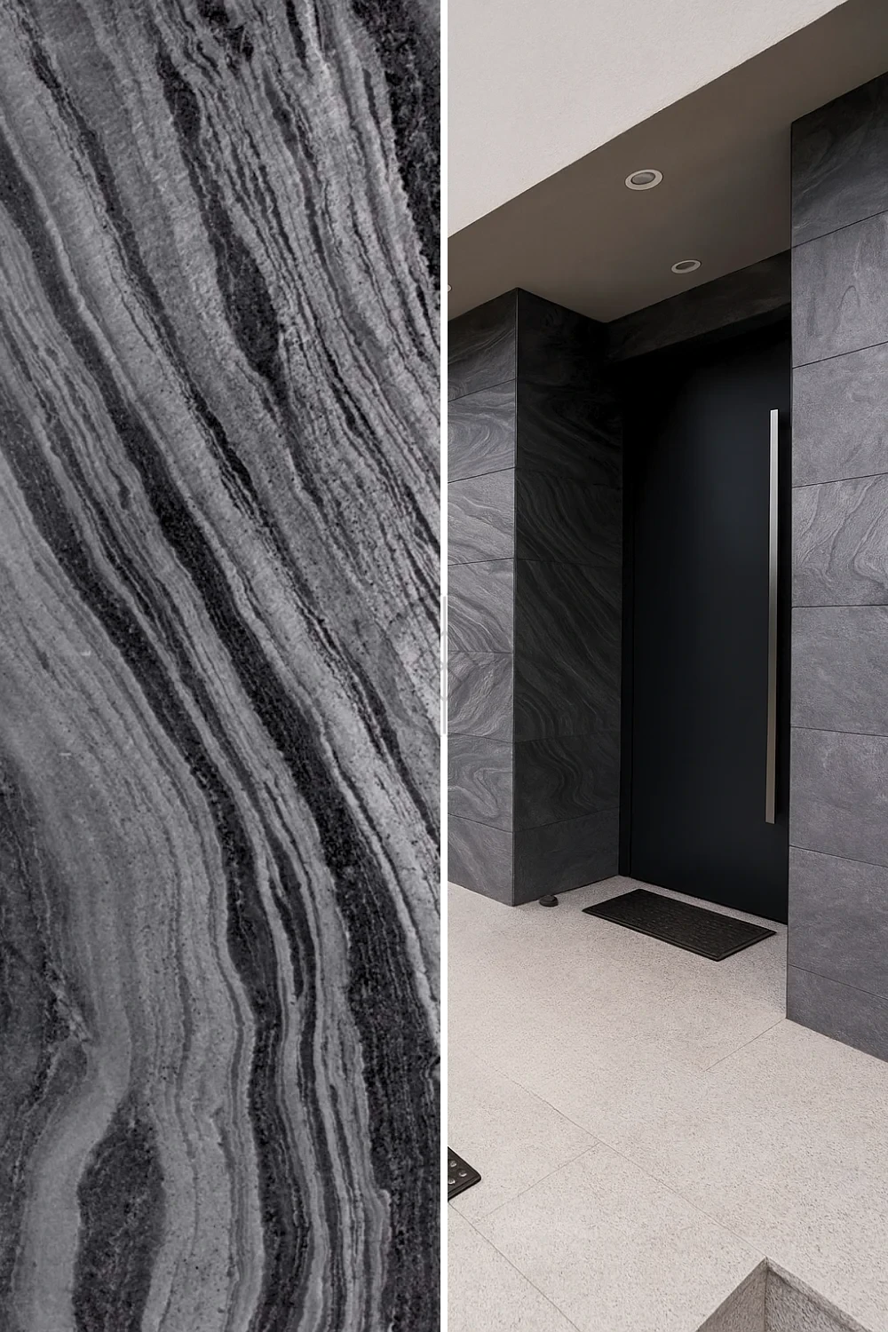 Fassadenstein Silver Grey Leather 30×90 cm – stilvolle Wandverkleidung mit strukturierter Oberfläche und kühlem Grauton.