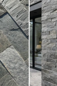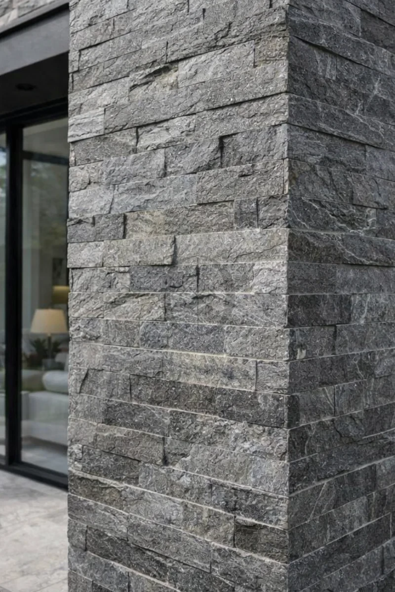 Quarzit-Fassadenstein Silver Shine – dekorative Verblendung mit glänzender, silbrig schimmernder Struktur für Innen- und Außenbereiche.