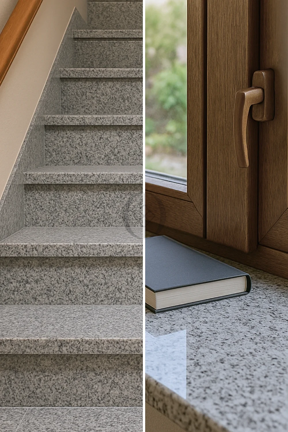 Polierter Granit Bianco Sardo G602 – elegantes graues Element zur Verwendung als Fensterbank oder Treppenstufe im Innenbereich.