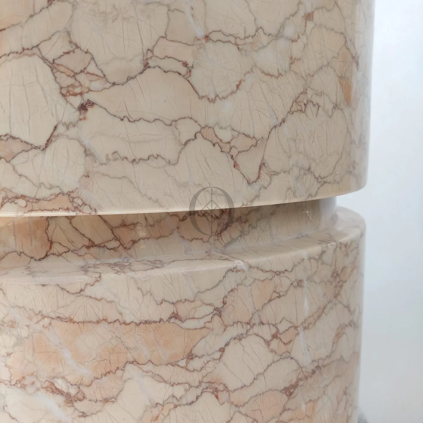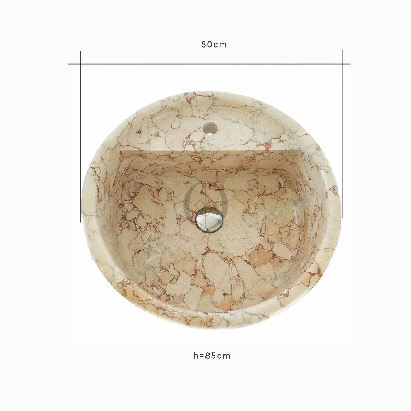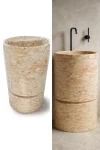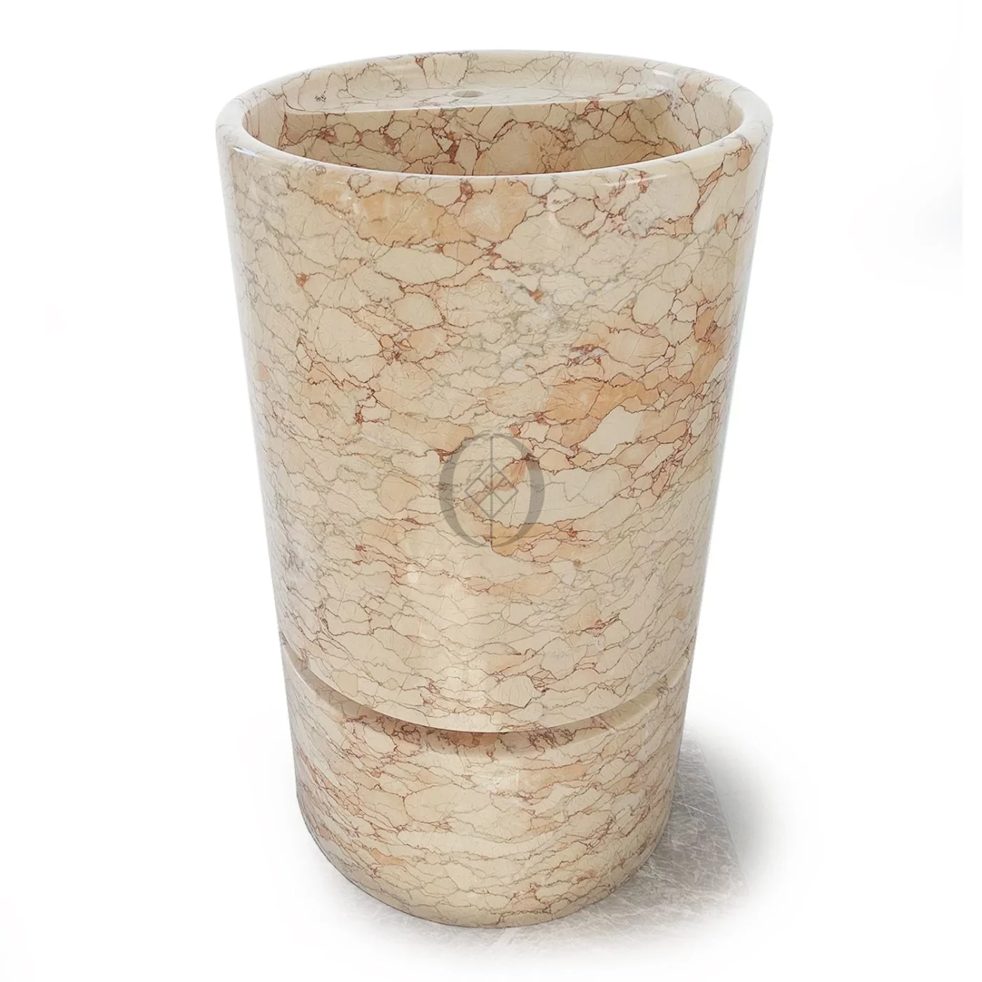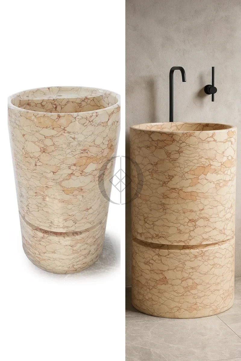 Marmorwaschbecken Sakura – freistehendes, poliertes Waschbecken aus rosafarbenem Marmor, 50×50×85 cm, elegantes Design und natürliche Einzigartigkeit.