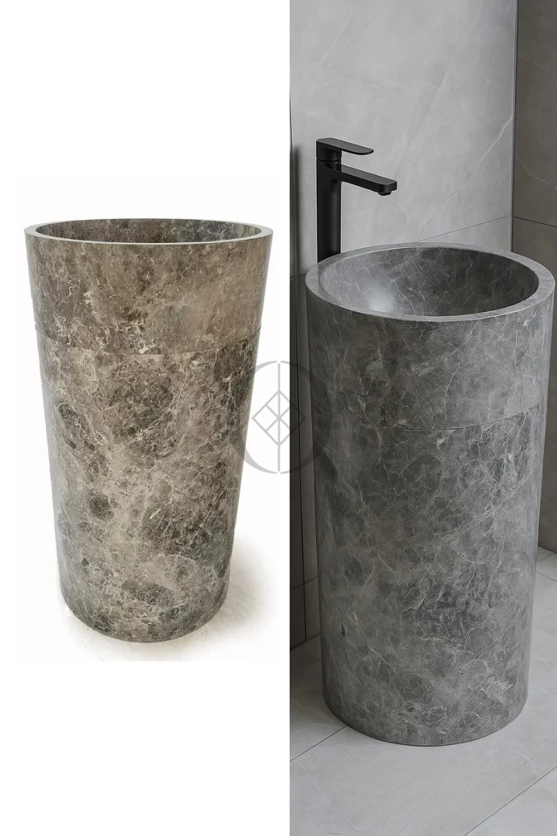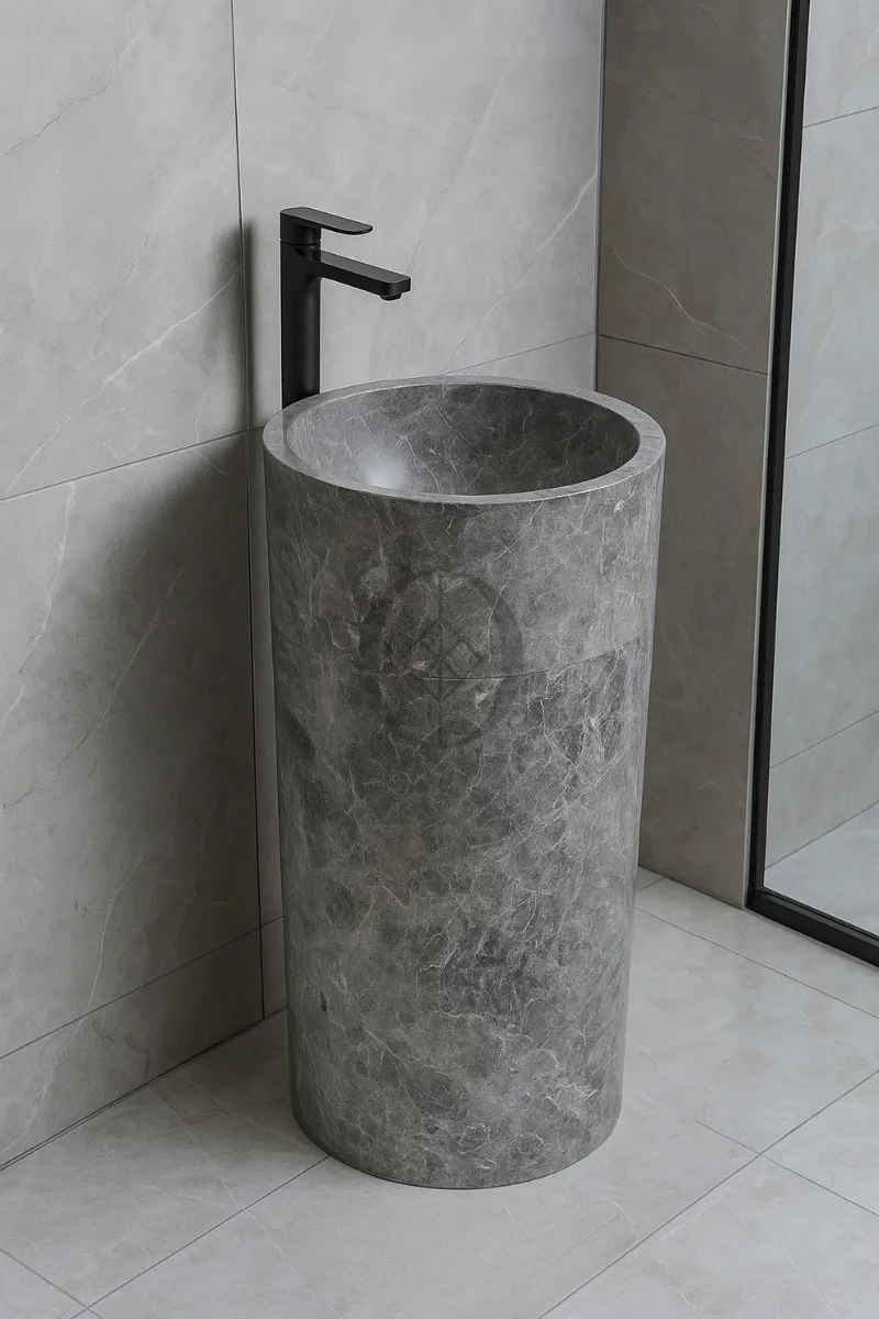 Marmor-Waschbecken Tundra Grey, freistehend mit satinierter Oberfläche, 44×44×83 cm – elegantes, natürliches Design und individuelle Aderung.
