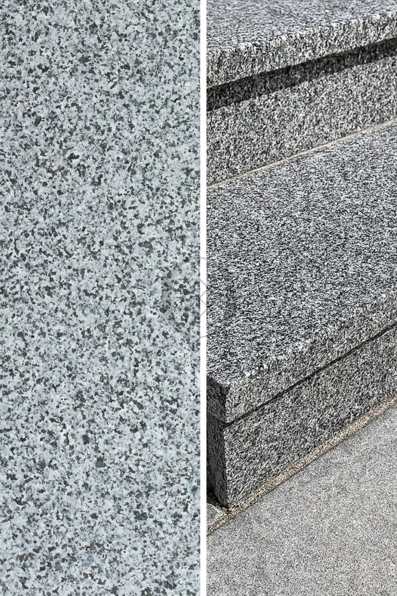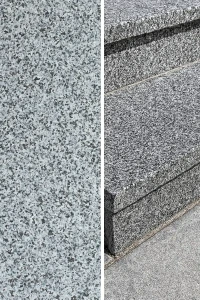Granitstufe Dark Grey New G654 – geflammte Oberfläche in Graphitfarbe für Außen- und Innentreppen.