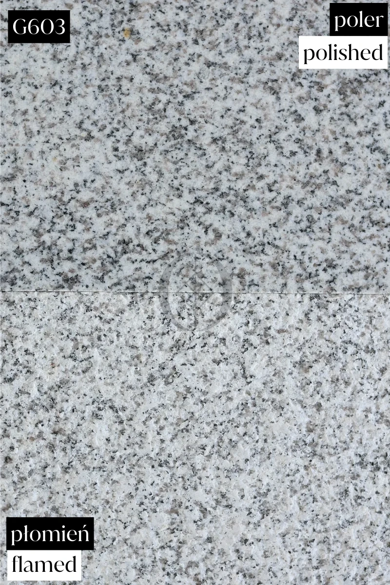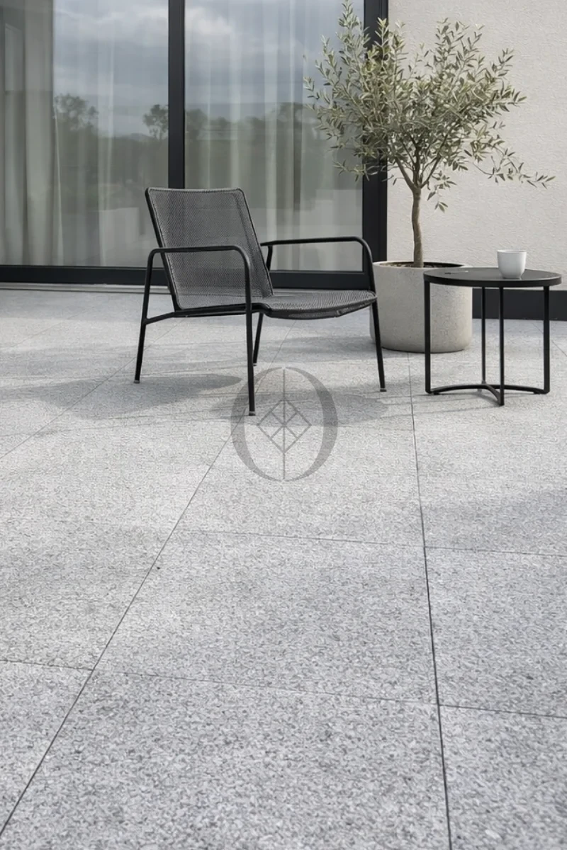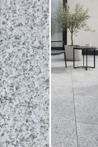 Flammenbearbeitete Granitfliese G603 New – grau, rutschhemmend und witterungsbeständig. Ideal für Terrassen, Treppen und Einfahrten.