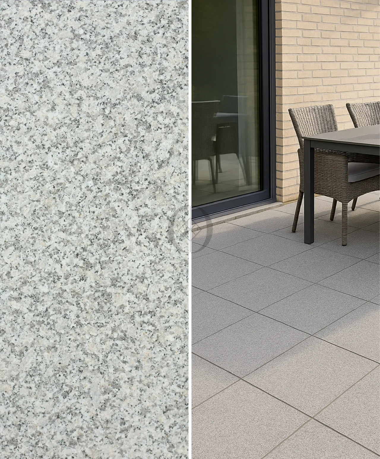 Granitfliese G602 – hellgraue, geflammte Oberfläche 60x60 cm für Außenbeläge und Treppen.