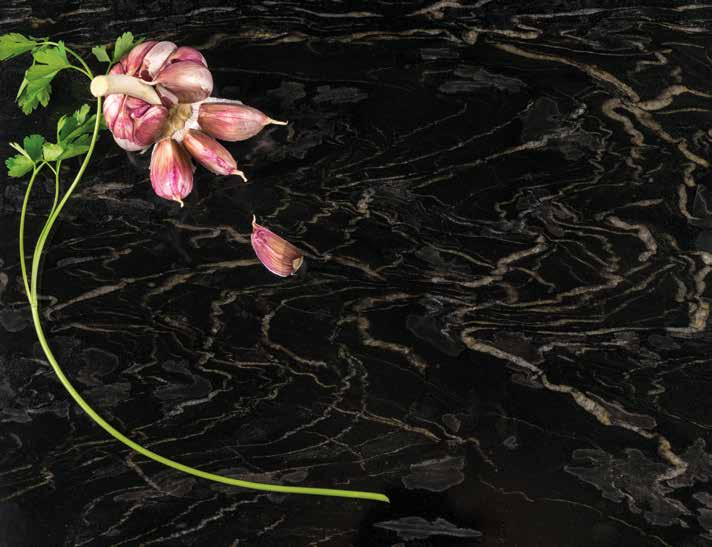 Cosmic Soft 2 cm – eleganter brasilianischer Granit im Slab-Format mit tiefschwarzem Hintergrund und dynamischen Adern in Weiß, Gold und Beige.