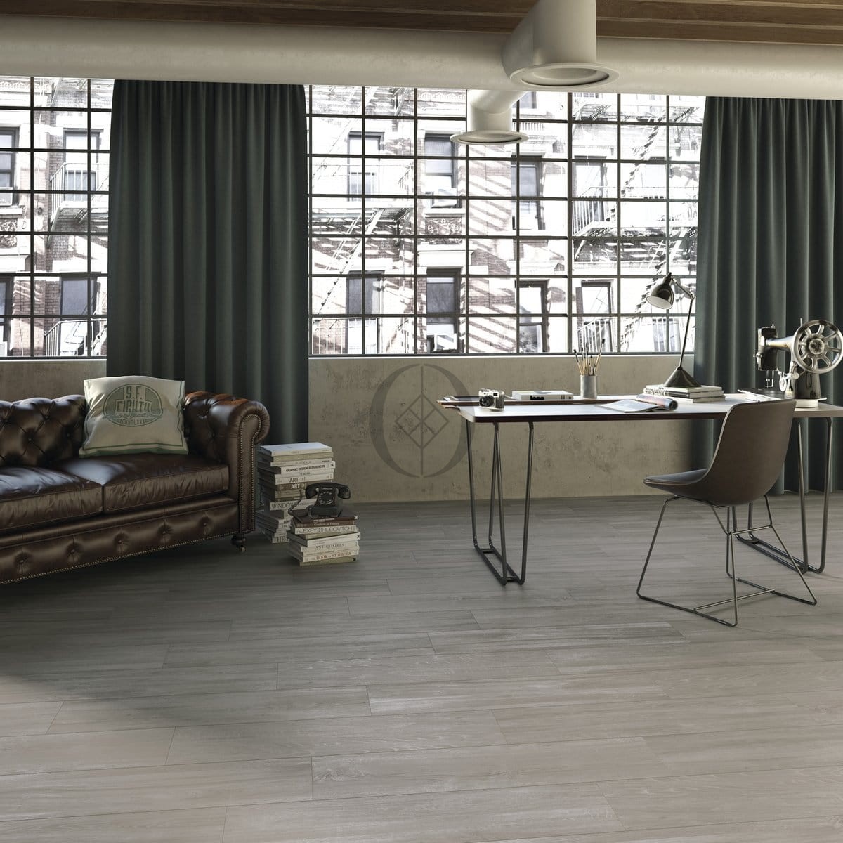 Holzoptik-Fliese Grove wood Grey 90x15x0,8 – graues Feinsteinzeug im Dielenformat mit ruhiger Maserung, eleganter, moderner Optik und hoher Alltagstauglichkeit.