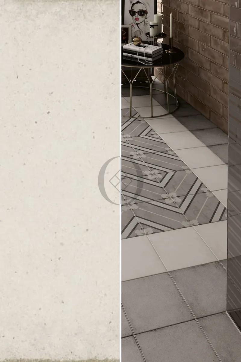 Art Nouveau Bone 20x20 Mat – dekorative, matte Wand- und Bodenfliese mit zeitlosem Jugendstil-Motiv in Elfenbein- und Grautönen.