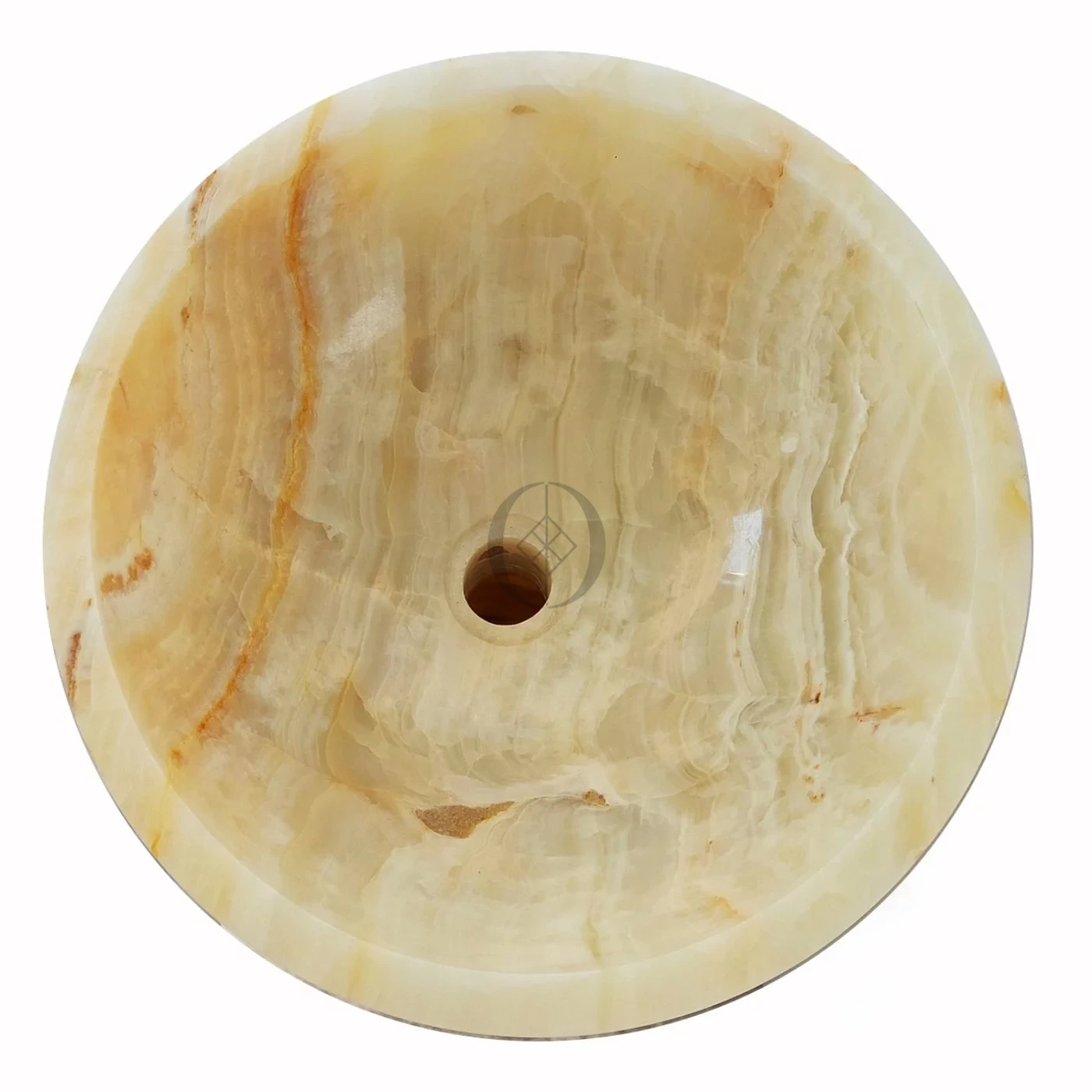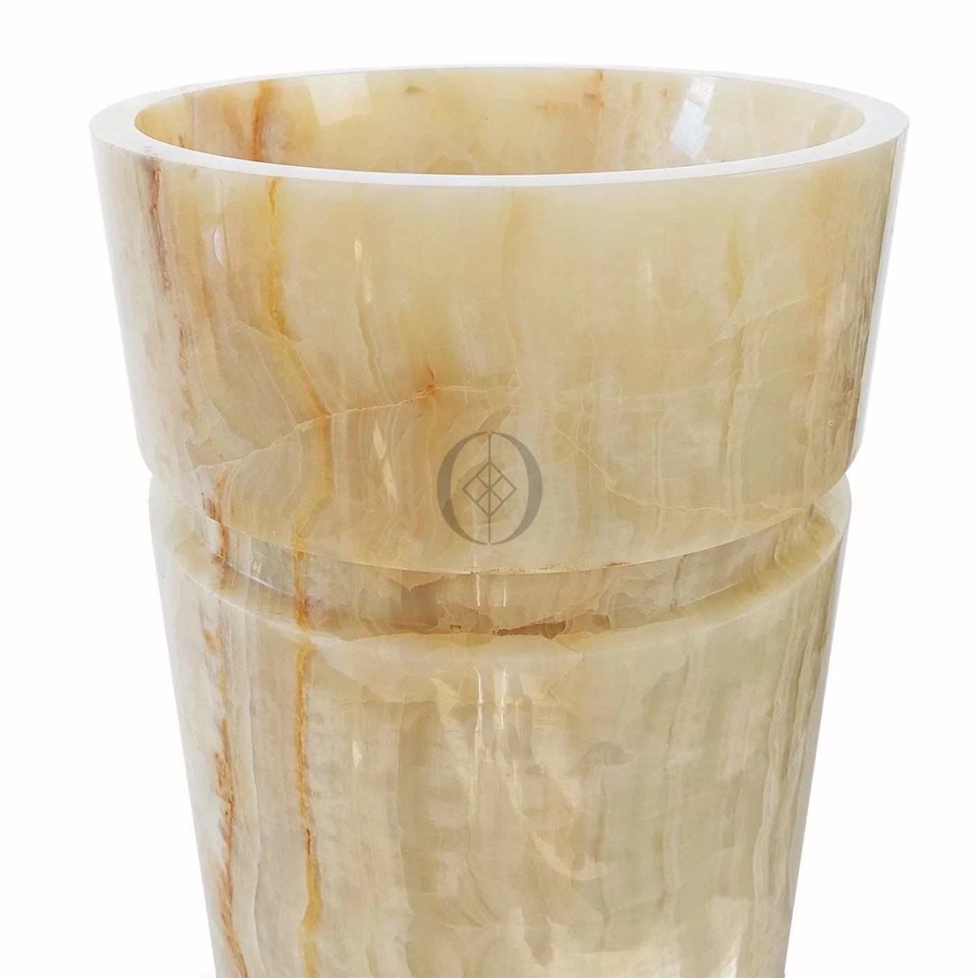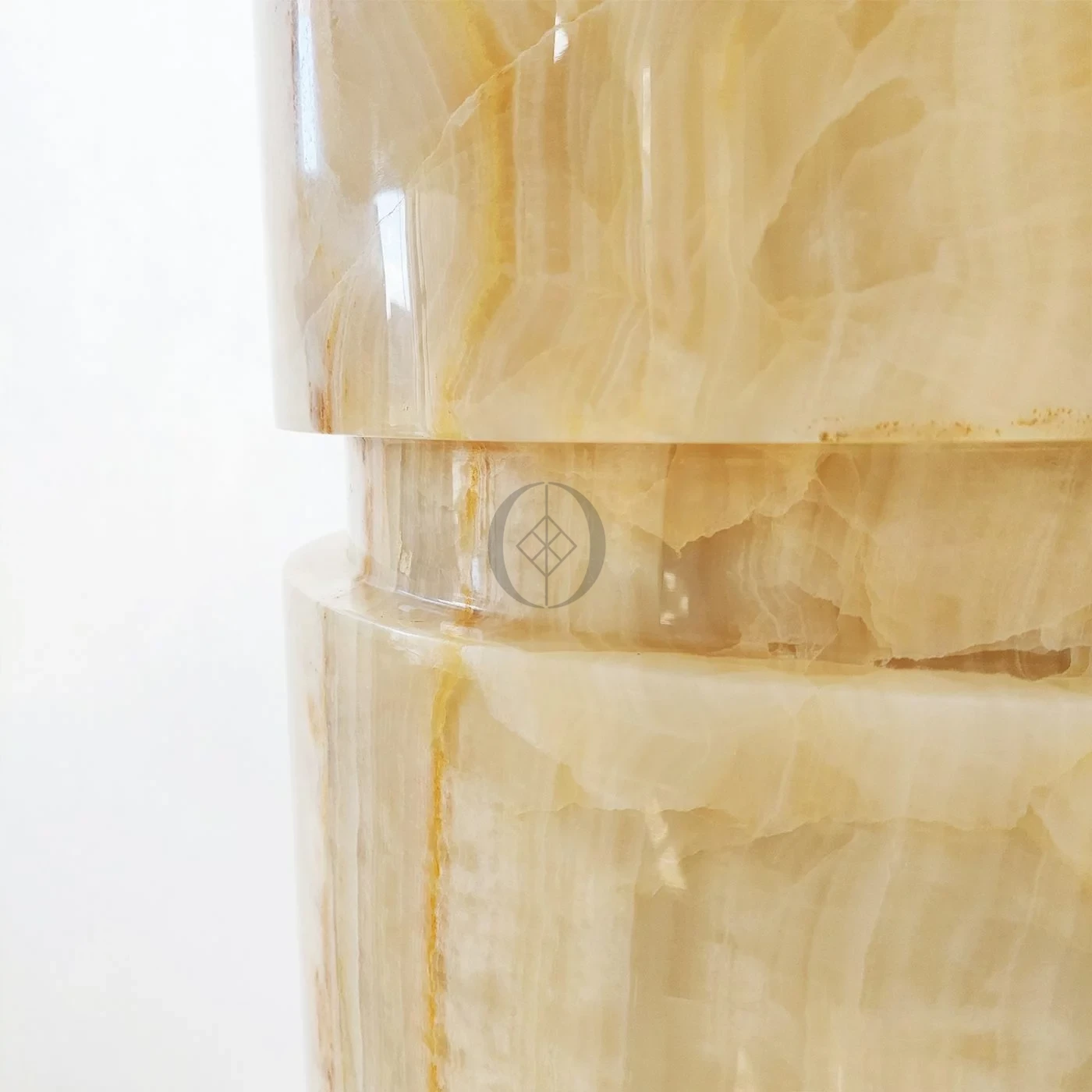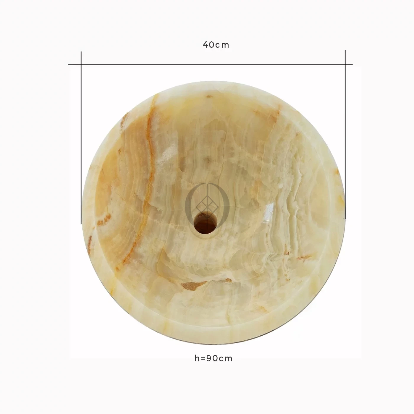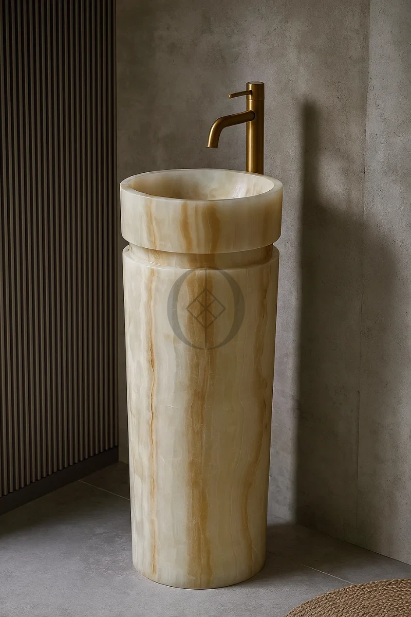 Onyx-Waschbecken White – freistehendes, poliertes Becken aus natürlichem weißem Onyx mit halbtransparenter Struktur und dezenter, cremiger Färbung; Maße 40×40×90 cm. Einzigartig in Optik und ideal für luxuriöse Bäder.