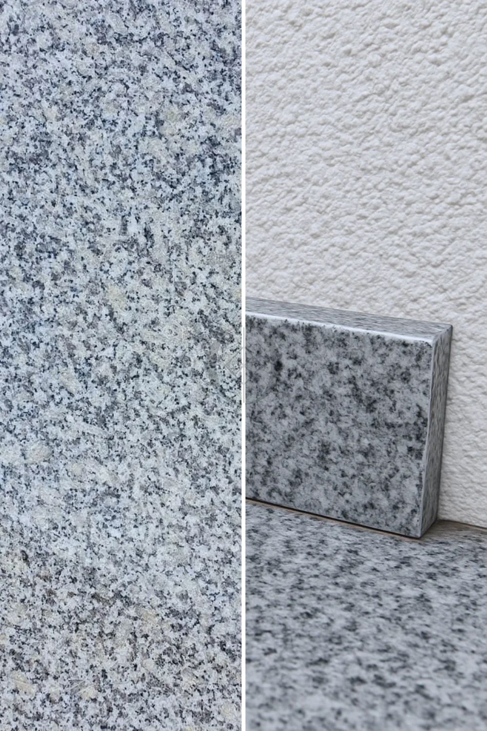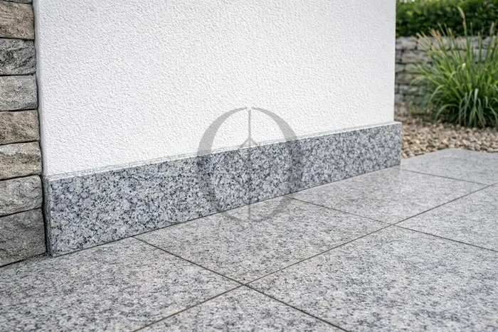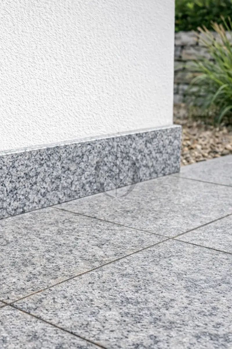 Polierter Granitsockel G602 61x8x1 cm ist eine elegante Abschlusslösung für Böden und Wände aus Naturstein in hellgrauer Nuance. Er harmoniert perfekt mit Fliesen und Treppenelementen in derselben Farbe und schafft ein einheitliches Ausführungssystem.