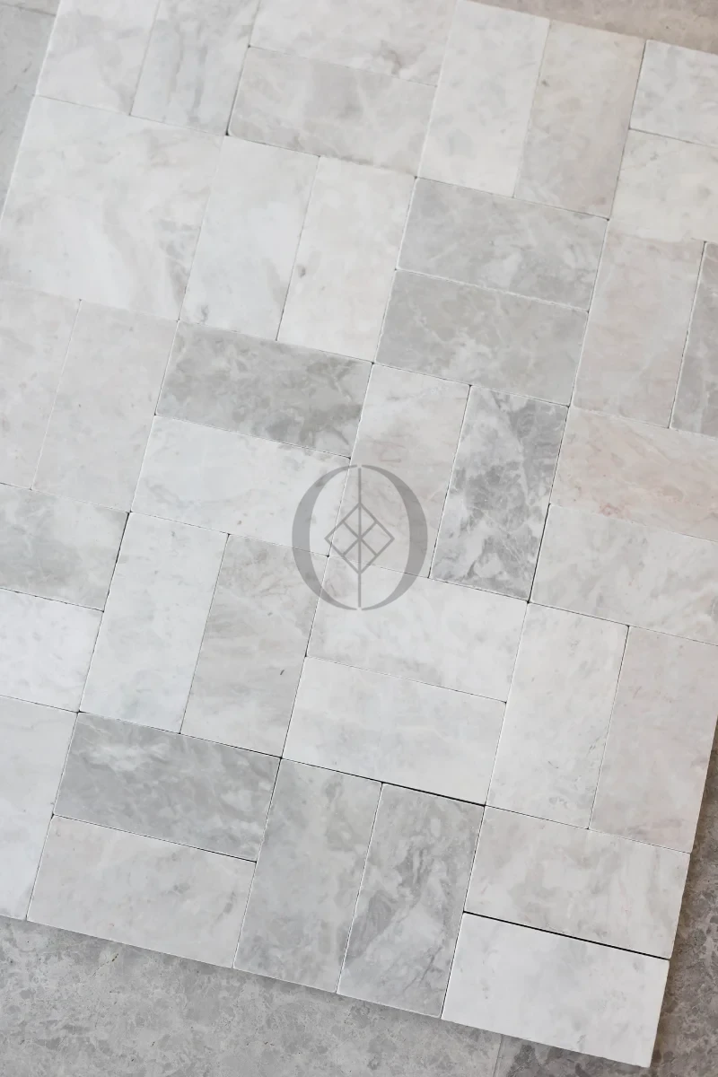Royal White ist ein natürlicher Marmor mit milchweißer Basis und feinen Adern in Grautönen und Beige. Jede Fliese ist einzigartig – Unterschiede in Zeichnung und Tonalität sind natürliche Merkmale des Steins, die seine Authentizität hervorheben.