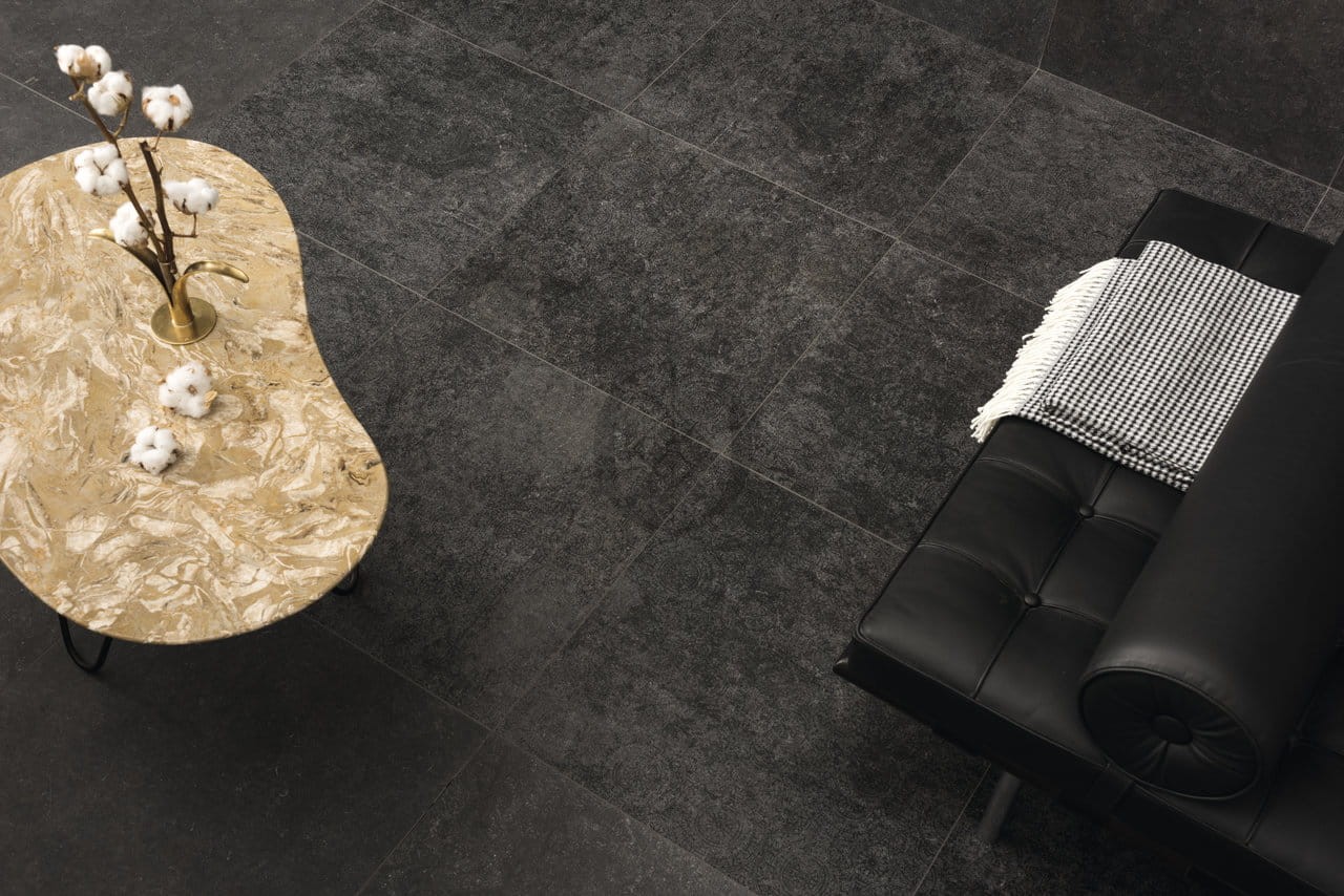 Feinsteinzeugfliese Domelia Silk Stone Black Chiffon 120x60 cm mit seidigem Finish und dezenter Steinoptik – elegant, langlebig und ideal für Küche, Bad sowie repräsentative Wohn- und Gewerberäume.