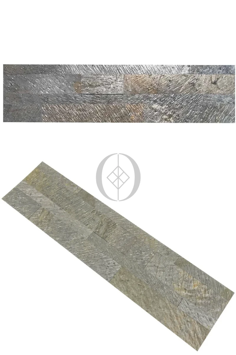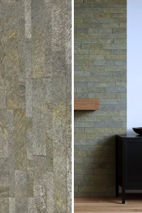 Das Panel 3D Gold Green besteht aus Steinfurnier mit einer Stärke von ca. 2 mm, das auf einem elastischen Träger mit selbstklebender Schicht aufgebracht ist. Dadurch vereint es das Aussehen natürlichen Steins mit geringem Gewicht und einfacher Montage. Die unregelmäßige Textur und die leicht reliefartige Oberfläche verleihen der Wand Tiefe und den Eindruck handverlegter Steinplatten.