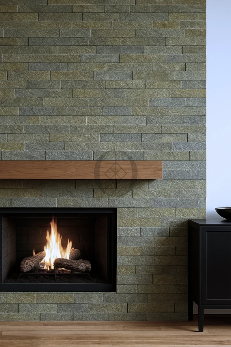 Dank der geringen Stärke nimmt die Verkleidung kaum Raum ein, und der Natursteinton Gold Green verleiht dem Raum Charakter und Noblesse. Diese Lösung ersetzt schwere Steinplatten oder Fassadenfliesen dort, wo einfache Montage wichtig ist.