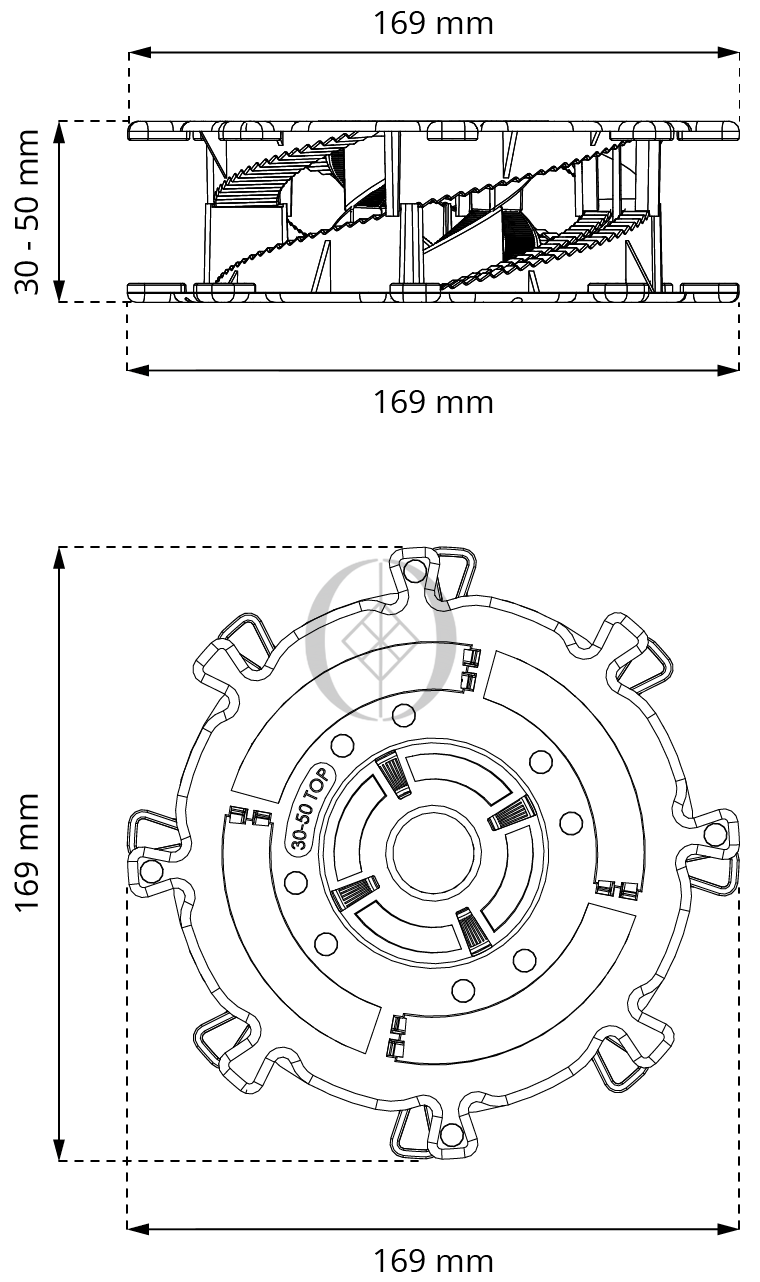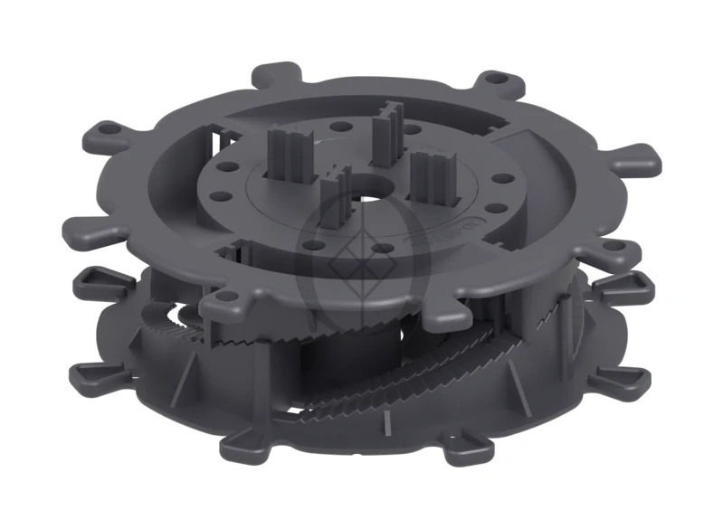 Spiral-Terrassenfuß 30–50 mm – spiralverstellbare Höhenanpassung für Terrassen mit Feinsteinzeugplatten und WPC-Dielen.