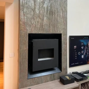 Steinfurnier Burning Forest – eine eindrucksvolle und flexible Verkleidung aus natürlichem Schiefer in Erdtönen und Feuernuancen.