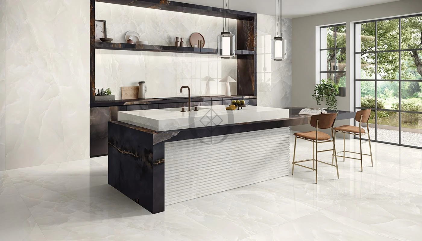 Großformatige Tele di Marmo Onyx Ivory 120x278 Lappato-Fliesen in Onyx-Optik: warmer Ivory-Ton, dezenter Lappato-Glanz und pflegeleichte Keramik für elegante, zeitlose Innenräume.