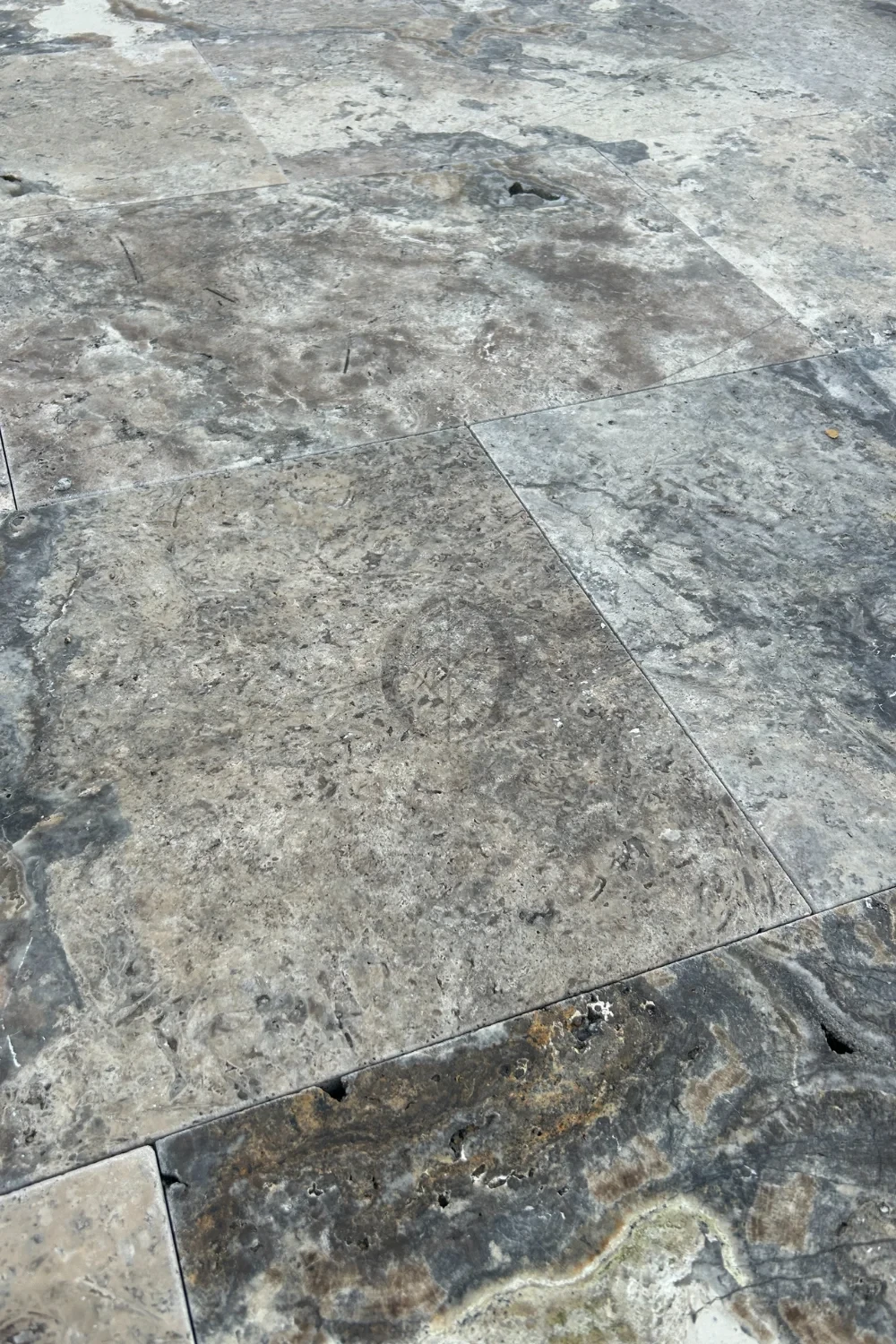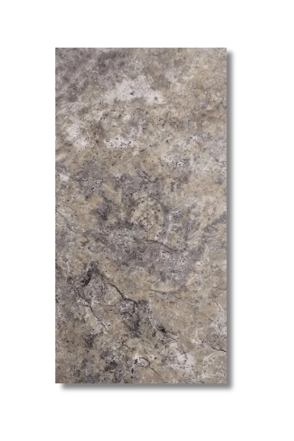 Travertin Ash Argent 3 cm im Format 40,6×61 cm – gealterte, trommelbearbeitete Platte für Terrasse, Garten und Poolbereich.