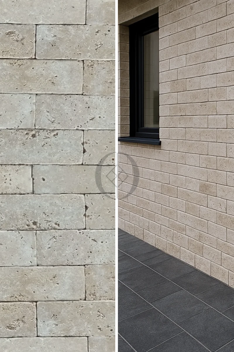Trommelbearbeiteter Fassadenstein aus Travertin Ivory Classic Mix – elegante und natürliche Wanddekoration.