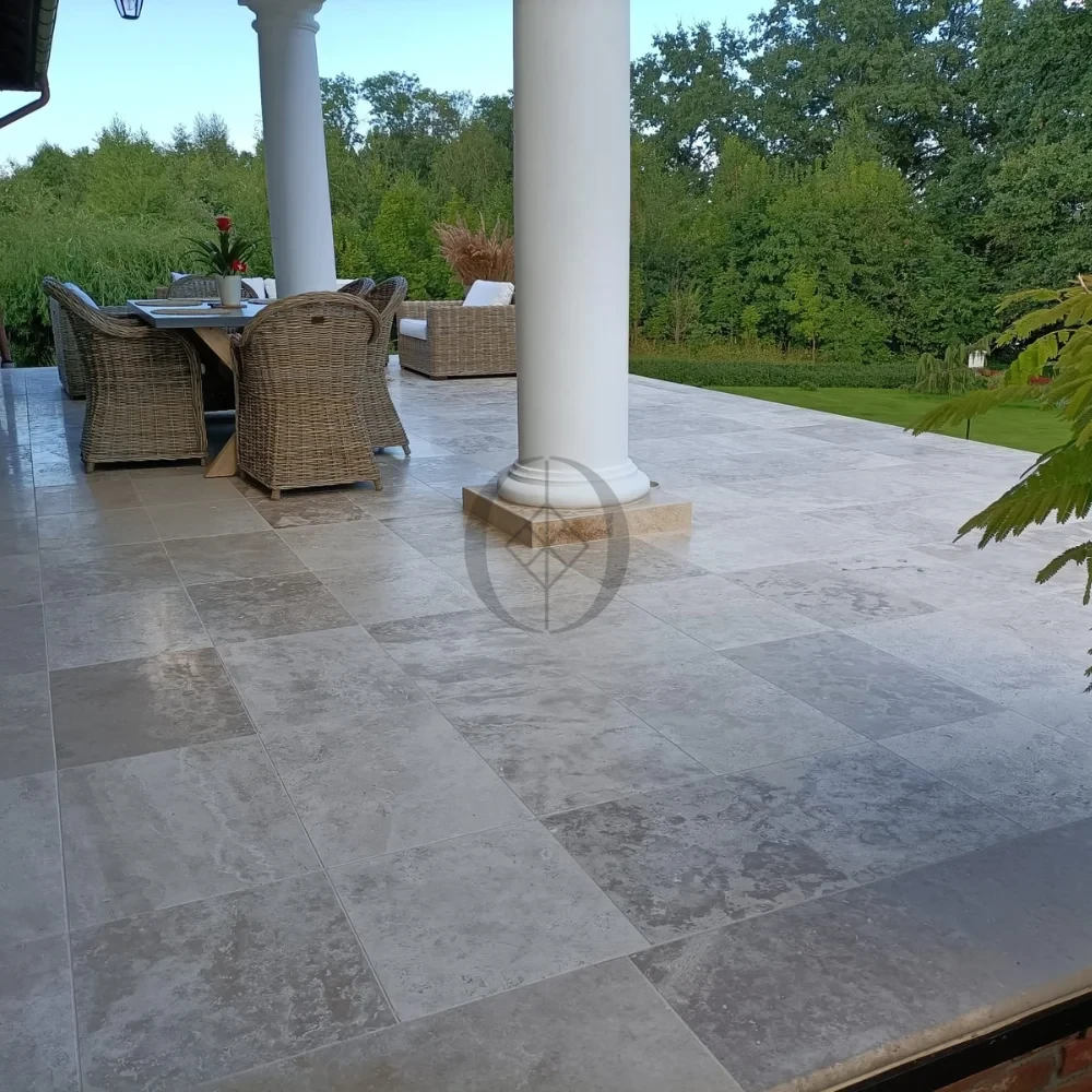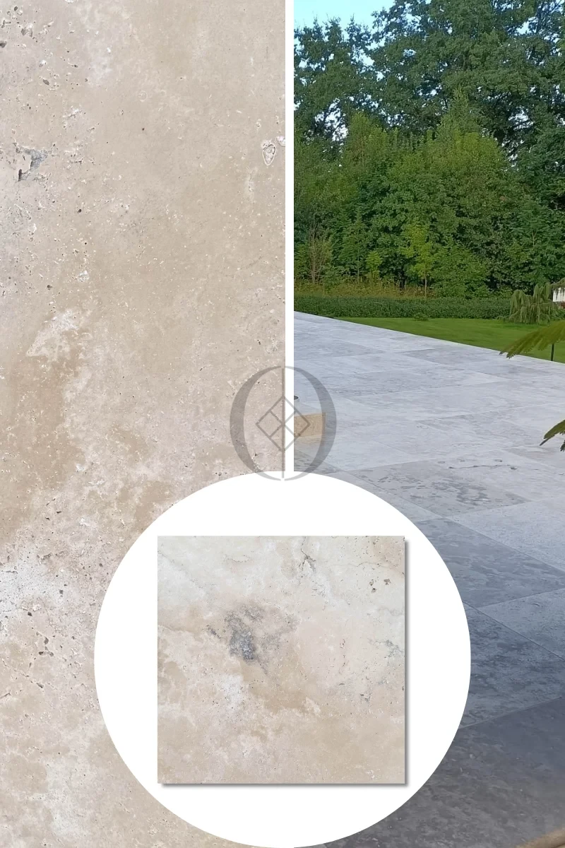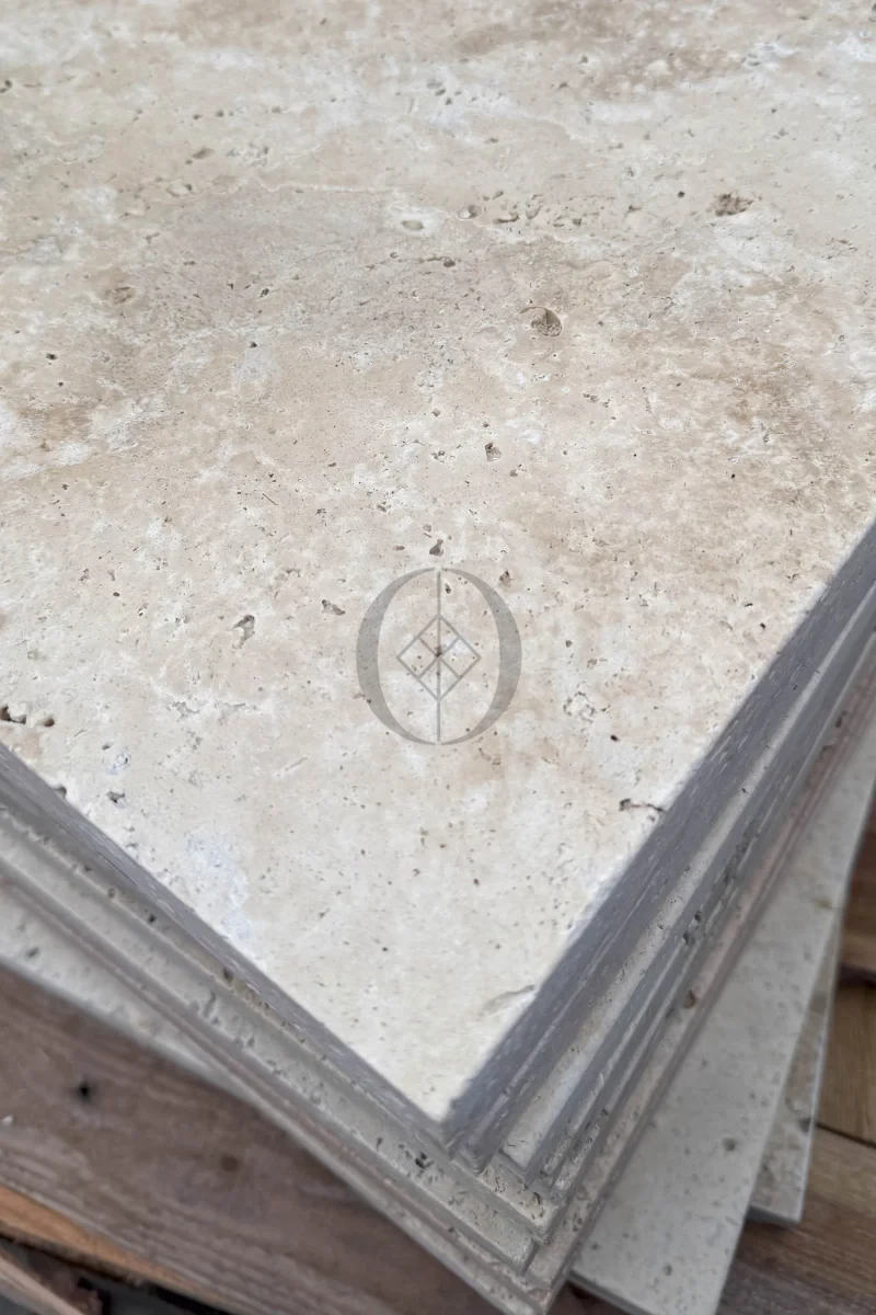 Travertin Ivory Classic Mix 61×61 cm – geschliffene und verspachtelte Natursteinfliese für elegante Innenräume.