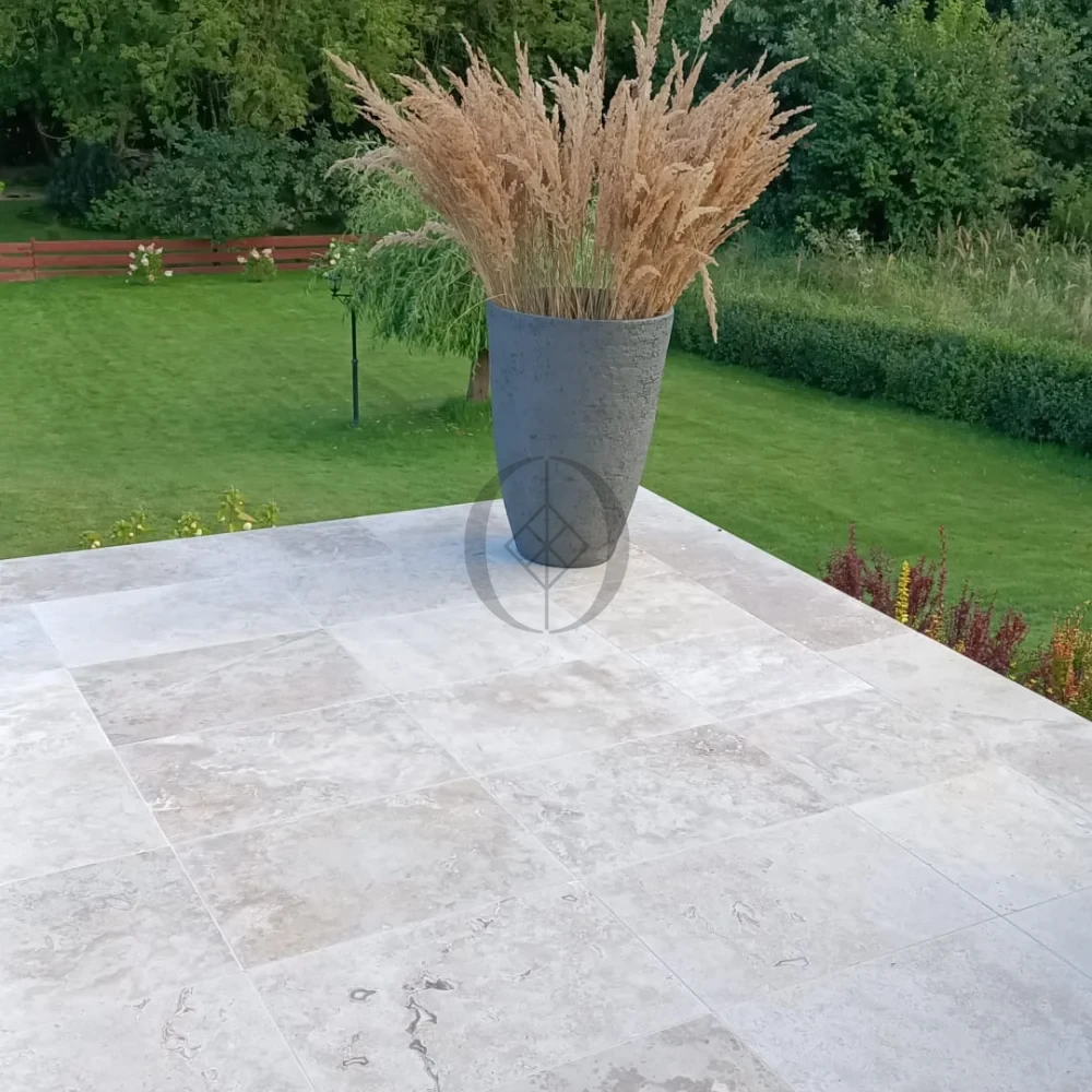 Massive Travertinplatte Ivory Classic Mix 61×61×3 cm – trommelbearbeitetes Finish, ideal für Terrasse, Gartenweg oder Patio.