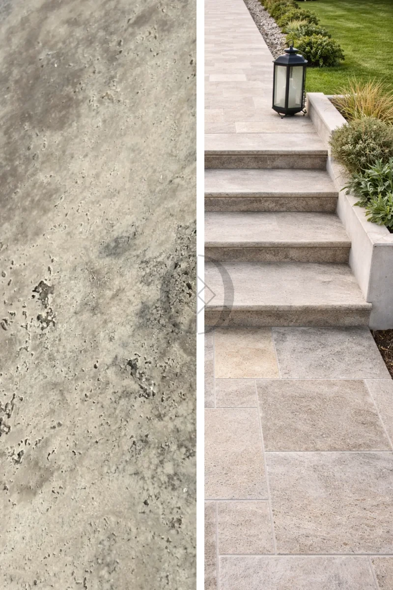 Trittstufe aus Travertin Ash Argent Mix 135×33 cm – geschliffene Oberfläche und abgerundete Bullnose-Kante für elegante Treppen.