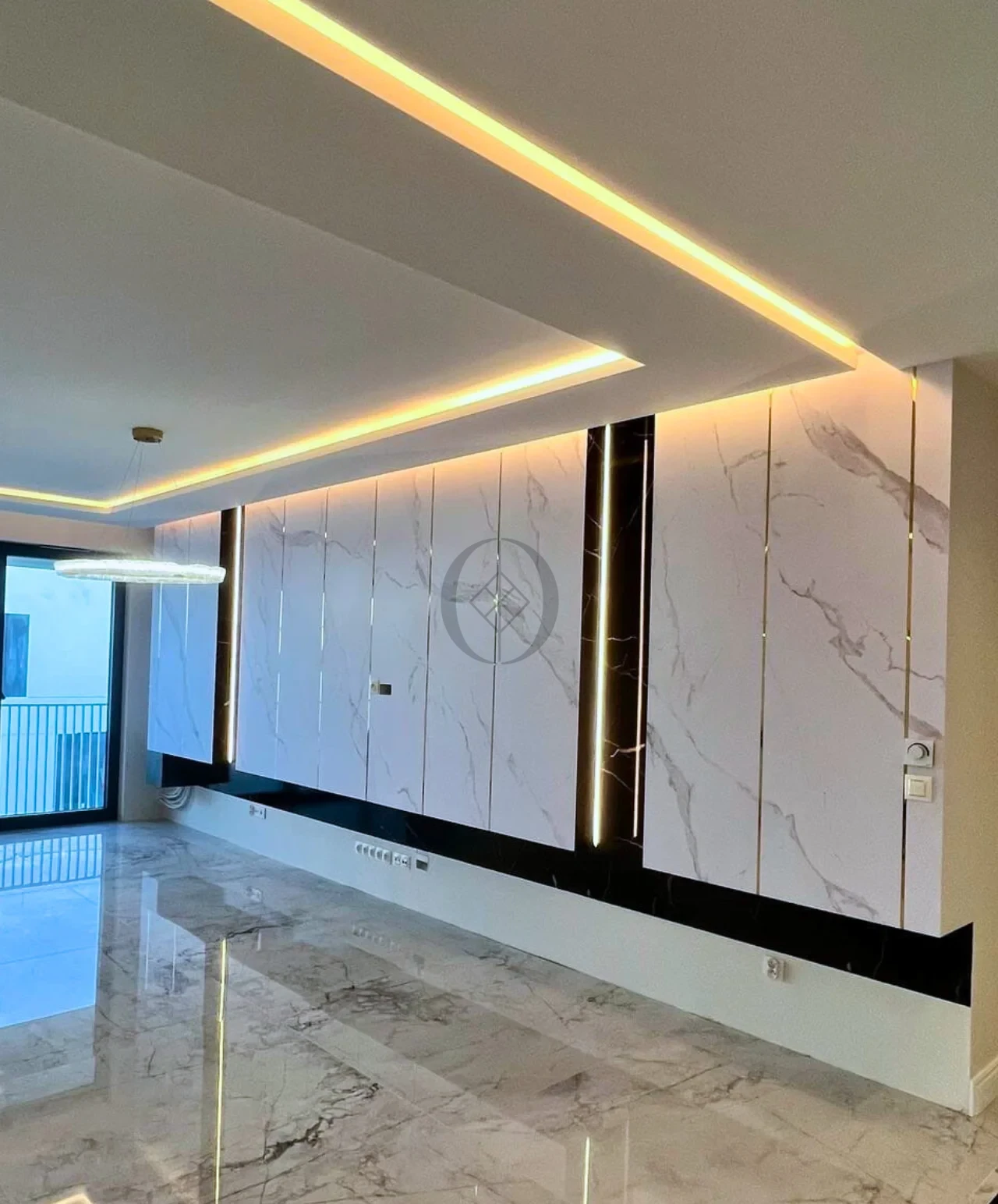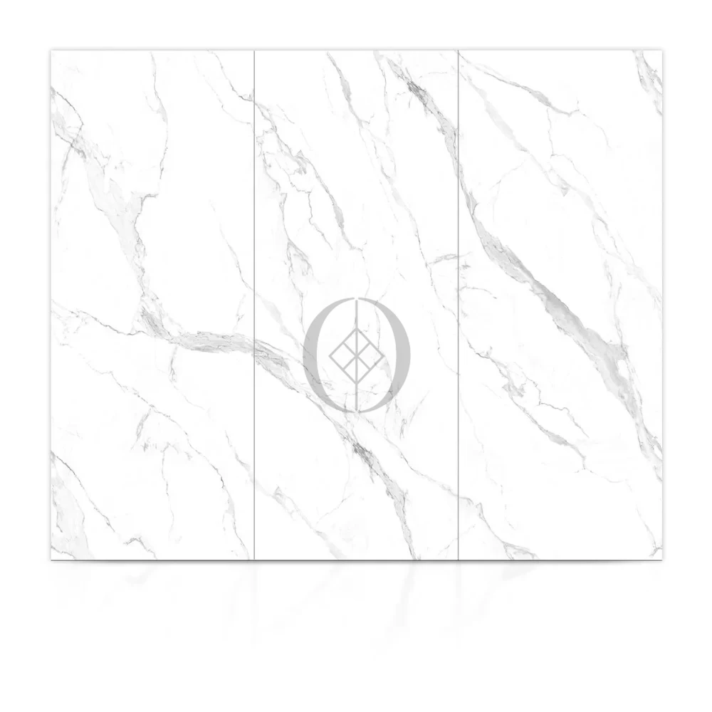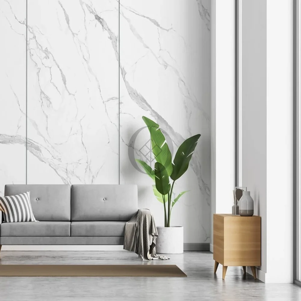 WPC-Platte Carrara im Hochglanz-Finish mit marmorinspirierter Optik, feuchtigkeits- und UV-beständig sowie pflegeleicht – ideal für hochwertige Wandverkleidungen.