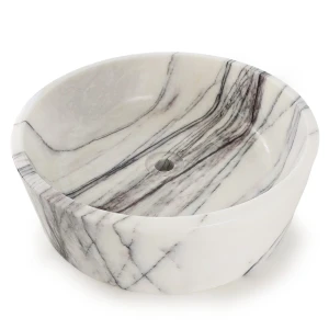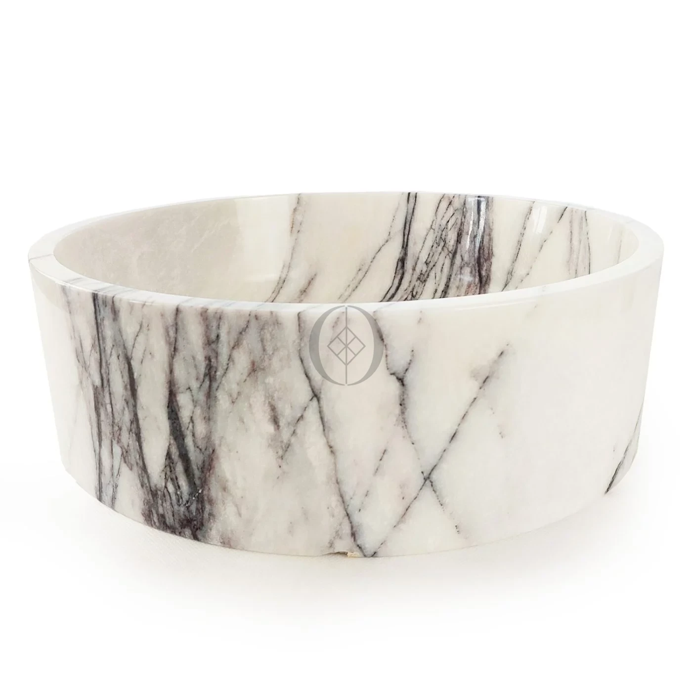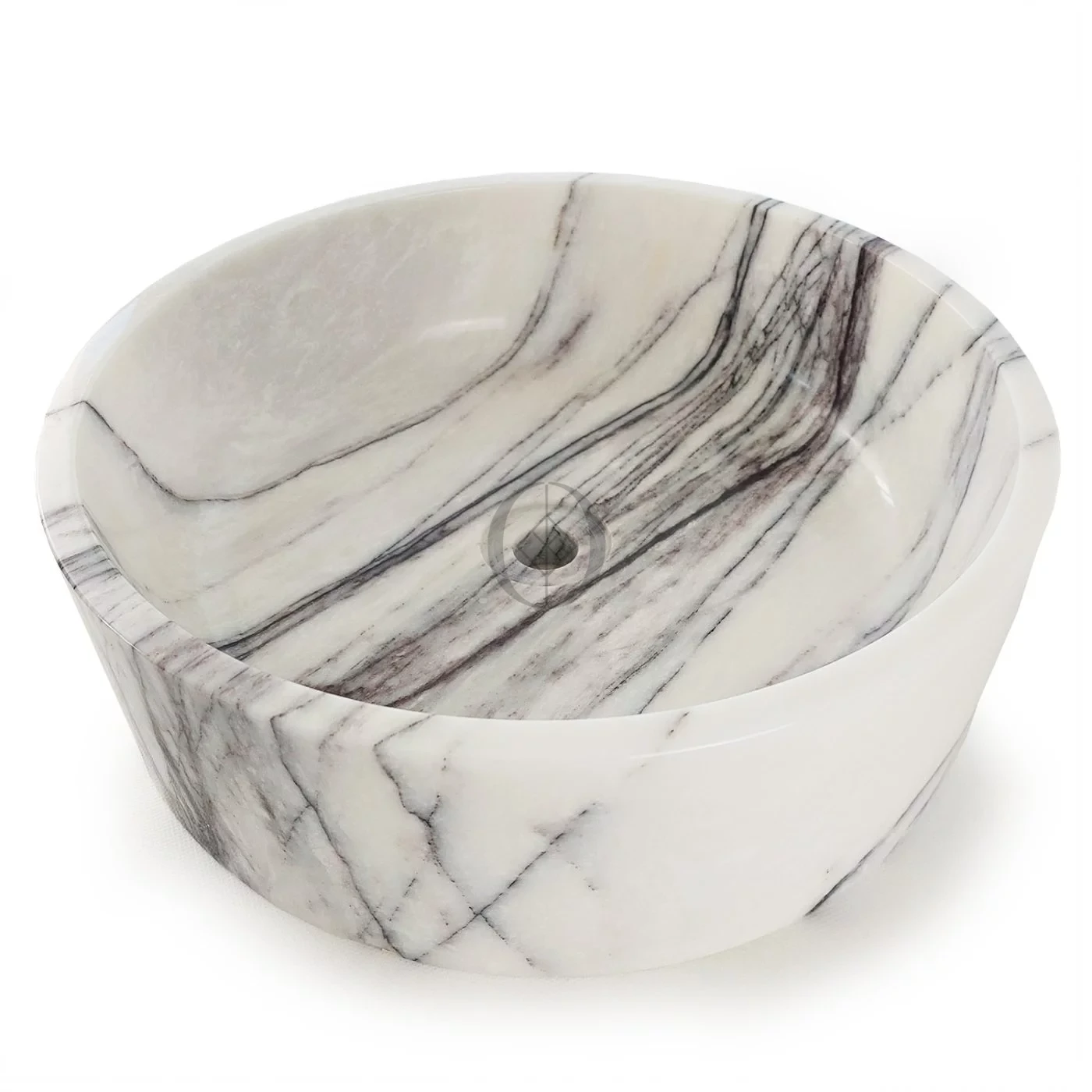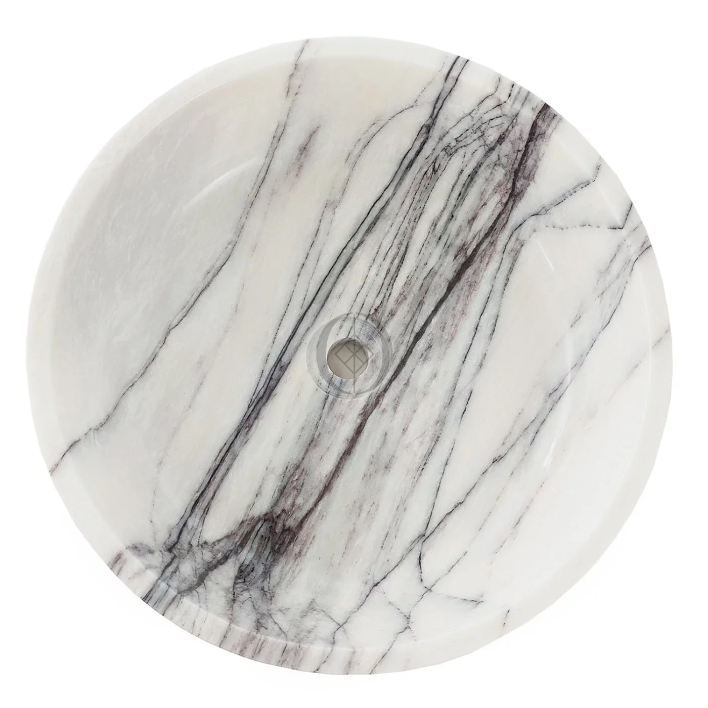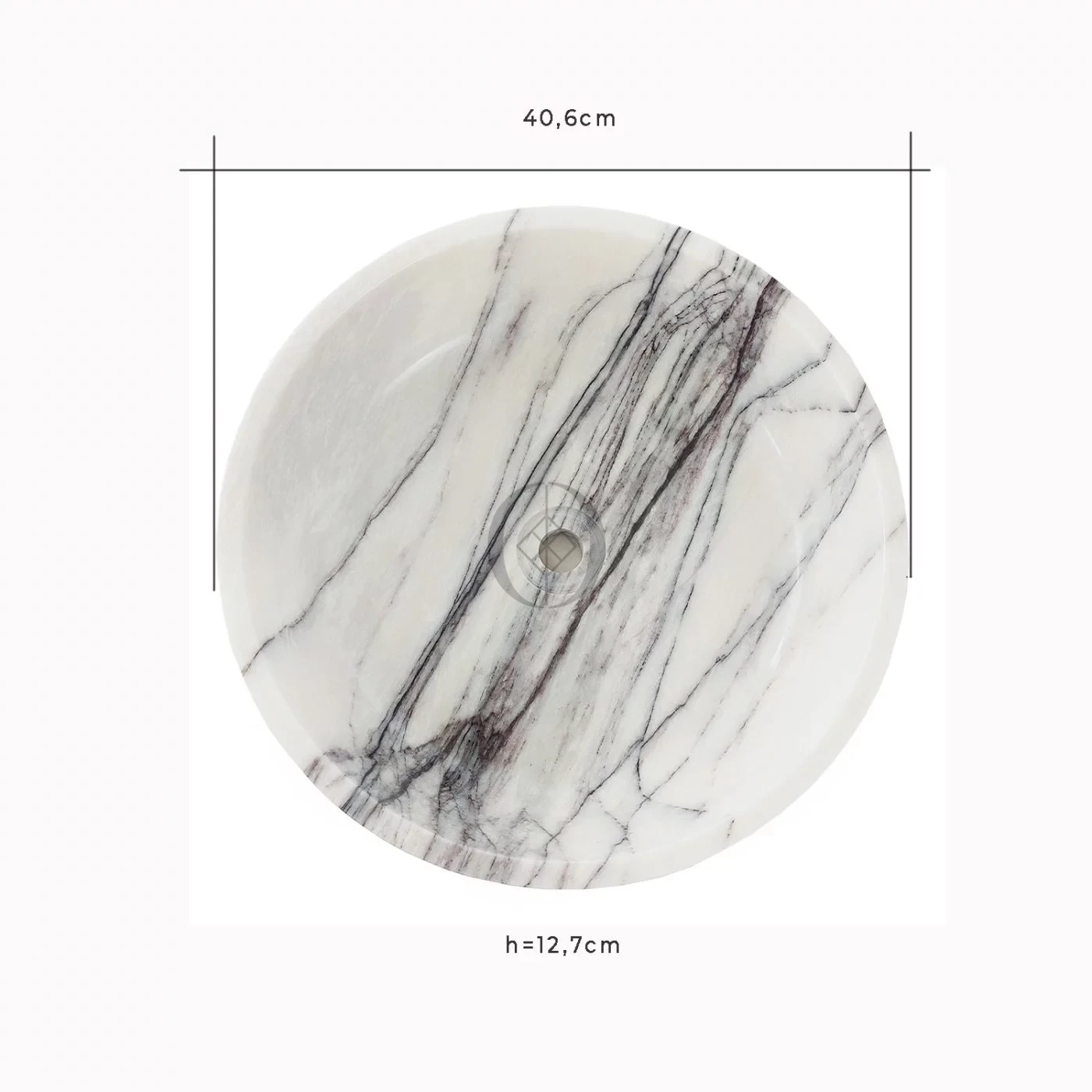 Marmor-Waschbecken Lilac, Weiß poliert – Aufsatzbecken aus naturweißem Marmor mit feiner grau-violetter Maserung, polierte Oberfläche, Maße 40,6×40,6×12,7 cm, ohne Überlauf; Bohrungen für Standarmatur (Ø ca.35 mm) und Ablauf (Ø ca.45/50 mm).